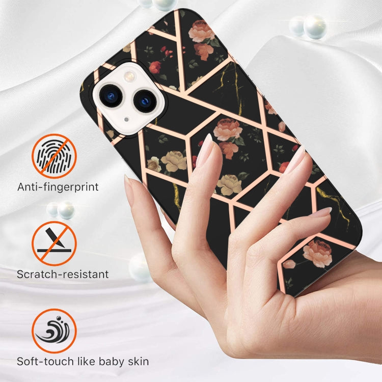 Funda para iPhone 15 Plus TPU Galvanoplastia Empalme Mármol Patrón de Flores a Prueba de Golpes (Flor Negra)