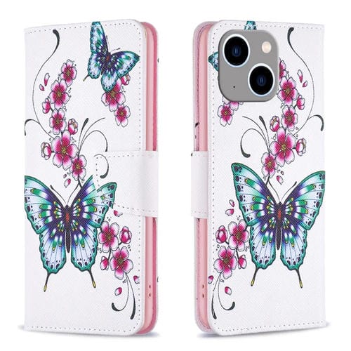 Funda de Cuero para iPhone 15 Plus Patrón de Dibujo Coloreado con Tapa (Mariposa de Flores)