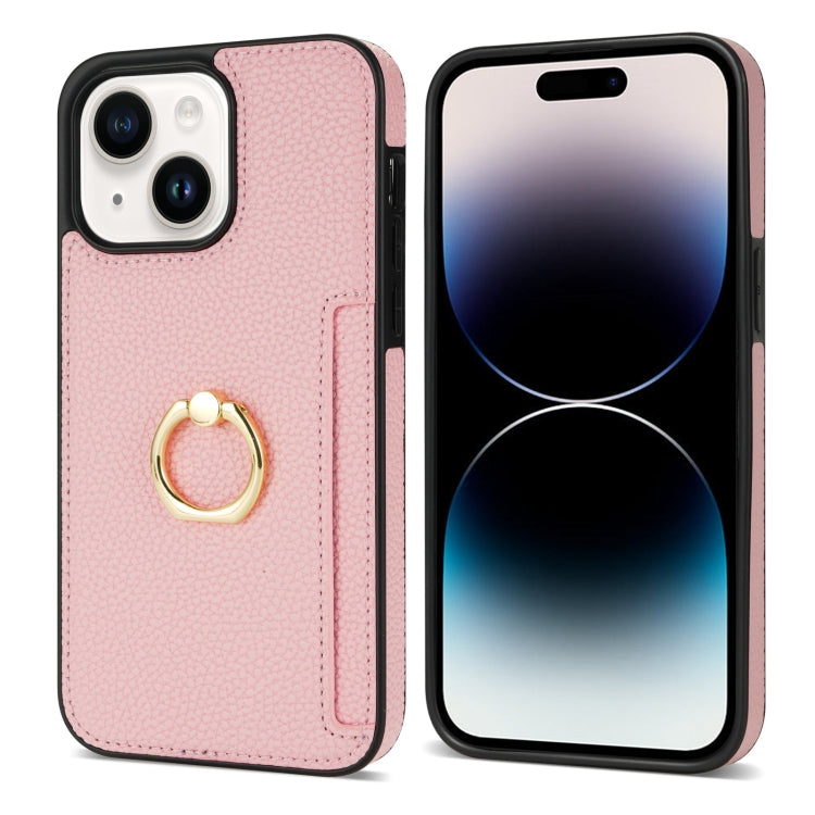 For iPhone 15 Plus Ring Card Litchi Leather Phone Back Case(Pink)
