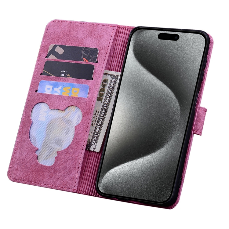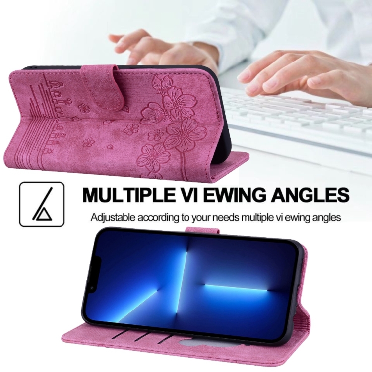 Estuche para Teléfono iPhone 15 Pro Cuero Relieve Gato Sakura Dibujos Animados (Rojo Rosa)