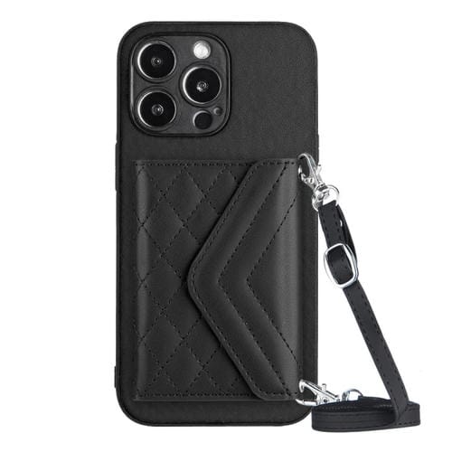 Estuche para Teléfono iPhone 15 Pro Rfid con Bolsa para Tarjetas Textura Rómbica y Cordón Largo (Negro)