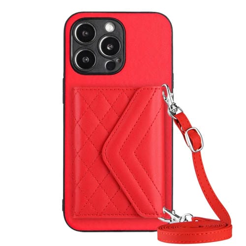 Estuche para teléfono iPhone 15 Pro Rfid con bolsa para tarjetas textura rómbica y cordón largo (Rojo)