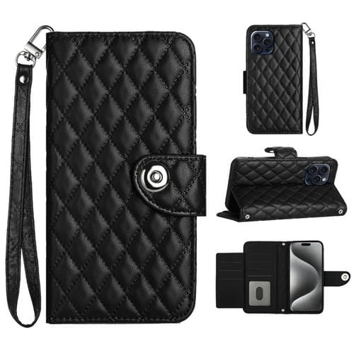 Funda de Cuero para iPhone 15 Pro con Tapa Textura Rómbica y Cordón (Negro)