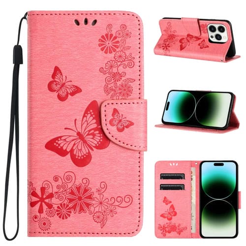 Funda de Teléfono iPhone 15 Pro Cuero con Tapa En Relieve de Mariposa (Rosa)