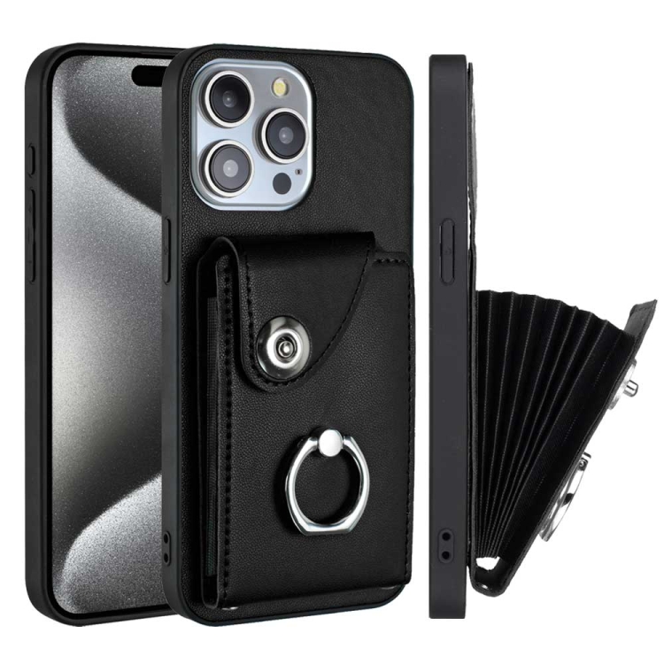 Funda para Teléfono iPhone 15 Pro con Soporte para Anillo y Bolsa para Tarjeta de Órgano (Negro)