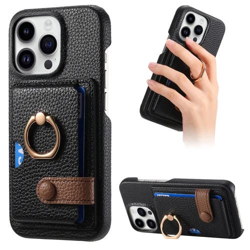 Funda para teléfono iPhone 15 Pro Litchi Leather Oil Edge Ring Card Back (Negro)