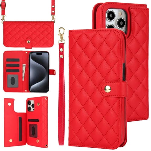 Estuche para Teléfono iPhone 15 Pro Max Crossbody Cuero Rómbico Multifunción (Rojo)