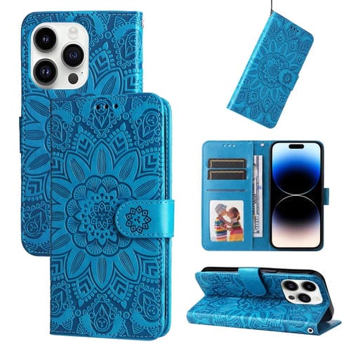 Estuche para Teléfono iPhone 15 Pro Max Cuero Estampado Girasol En Relieve (Azul)