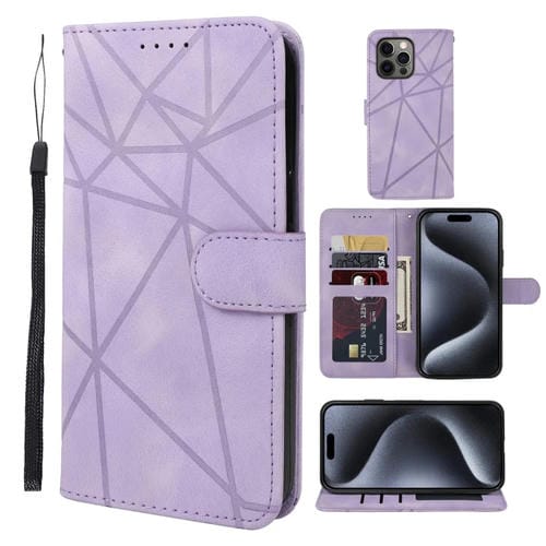 Funda para iPhone 15 Pro Max Skin Feel de Cuero con Líneas Geométricas (Púrpura)