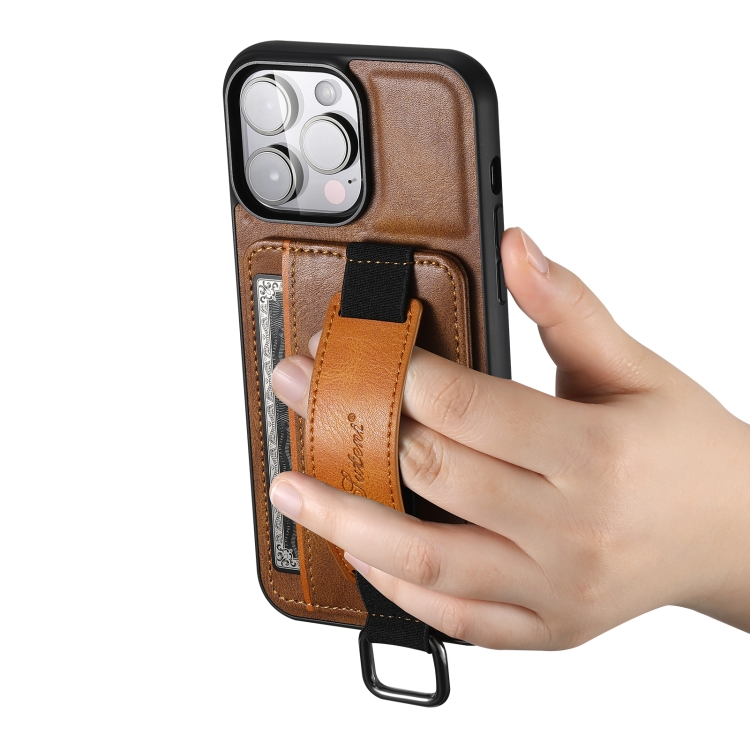 Funda para teléfono Suteni H13 para iPhone 15 Pro con tarjeta monedero y correa para la muñeca (Marrón)