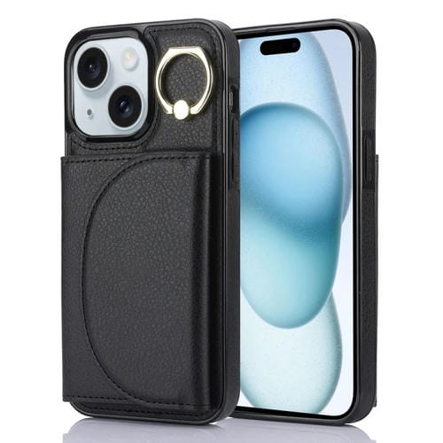 For iPhone 15 YM006 Leather Feeling Card Holder Ring Holder Phone Case (Black)