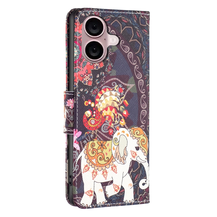 Funda de Cuero para iPhone 16 con Tapa y Patrón de Dibujo de Colores (Elefante de Flores)