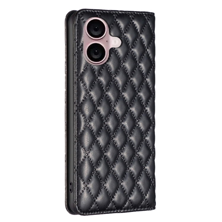 Funda para Teléfono iPhone 16 con Tapa de Cuero Magnético Diamond Lattice (Negro)