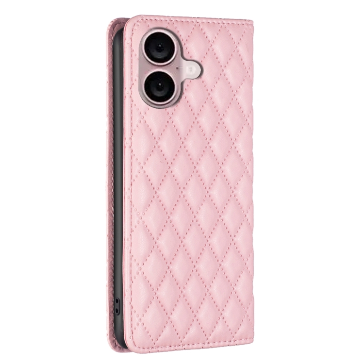 Funda para Teléfono iPhone 16 con Tapa de Cuero Magnético Diamond Lattice (Rosa)