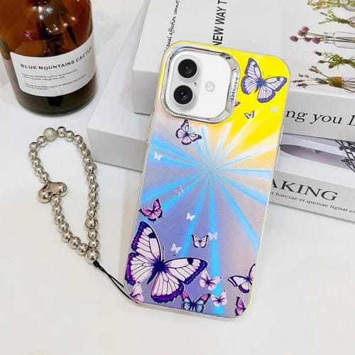 Estuche para teléfono iPhone 16 Plus con Mariposa Láser Galvanizada y Correa para la Muñeca (Mariposas Moradas)