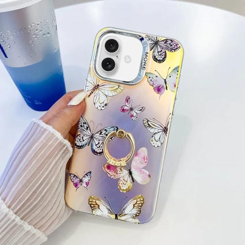 Estuche para Teléfono iPhone 16 Plus con Soporte para Anillo Mariposa Láser con Galvanoplastia (Mariposas Rosadas Ab2)
