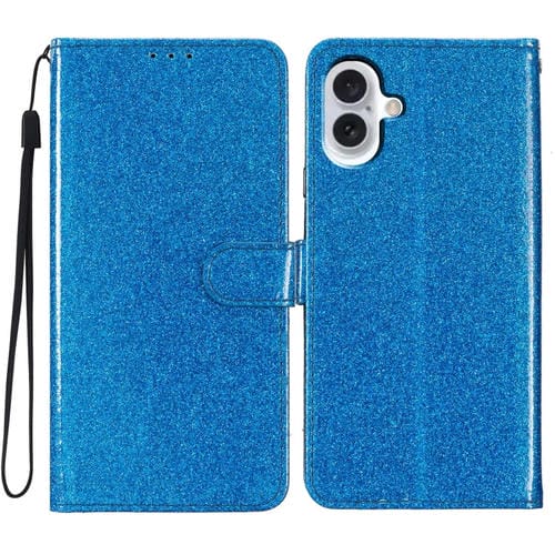 Funda de Cuero para iPhone 16 Plus con Tapa y Purpurina en Polvo (Azul)