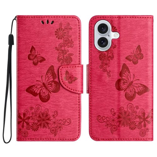 Funda de Cuero para iPhone 16 Plus con Tapa y Relieve de Mariposa (Rojo)