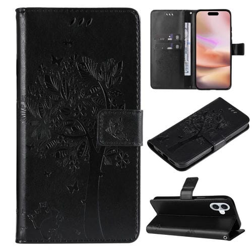 Funda para Teléfono iPhone 16 Plus Cuero con Tapa Patrón En Relieve Árbol y Gato (Negro)