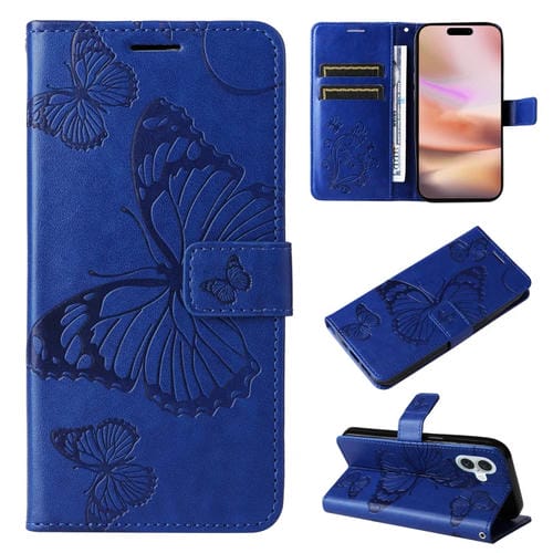 Funda para Teléfono iPhone 16 Plus Cuero con Tapa Patrón Mariposa 3D (Azul)