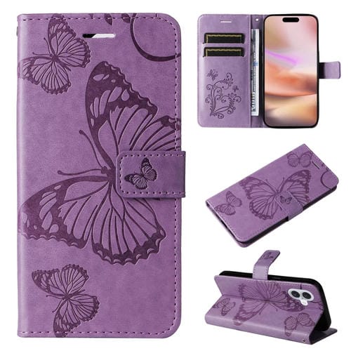 Funda para Teléfono iPhone 16 Plus Cuero con Tapa Patrón Mariposa 3D (Púrpura)