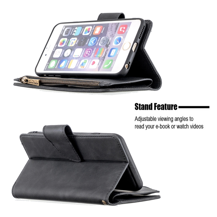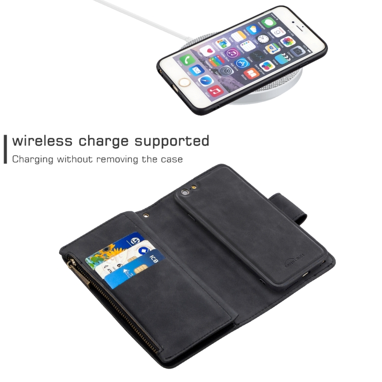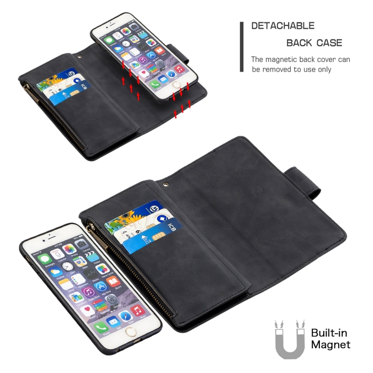 Estuche de Cuero PU Skin Feel para iPhone 6 Plus con Cremallera Magnética Desmontable Tapa Horizontal Ranuras Tarjetas Soporte Billetera Marco Fotos Cordón (Negro)
