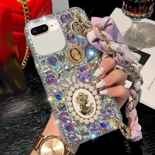 Caja para iPhone 7 Plus/8 Plus PC Pulsera Bufanda Piedra Preciosa Púrpura Diamante Hecho a Mano (Blanco)