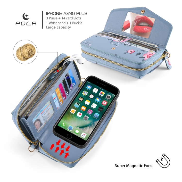 Funda de Cuero Pola Flower para iPhone 7 Plus/8 Plus con Billetera Cruzada Multifuncional y Cremallera (Azul)