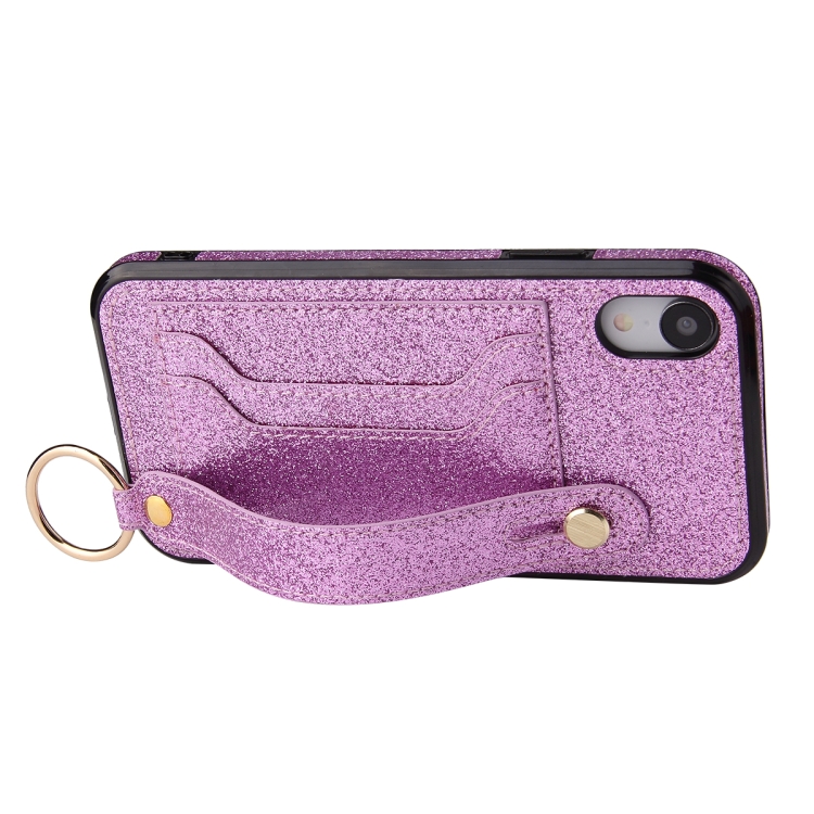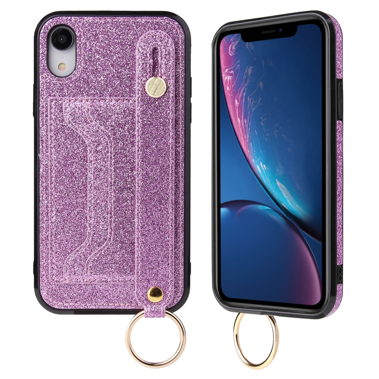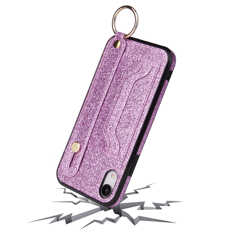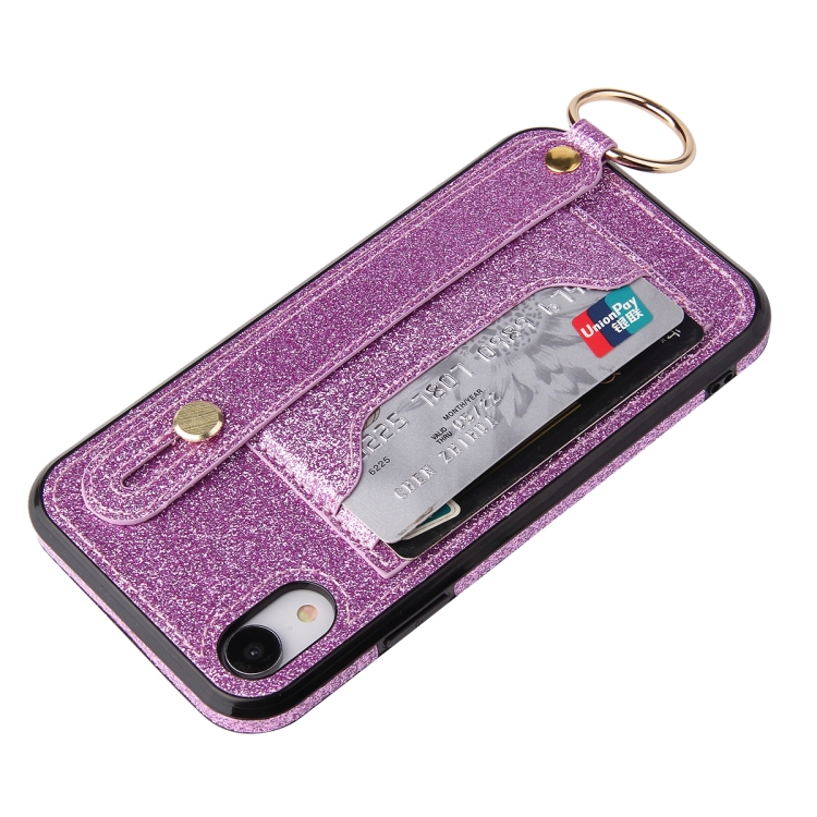 Estuche protector para iPhone X Xs Glitter Powder PU TPU a prueba de golpes con soporte ranuras para tarjetas y correa (Púrpura)