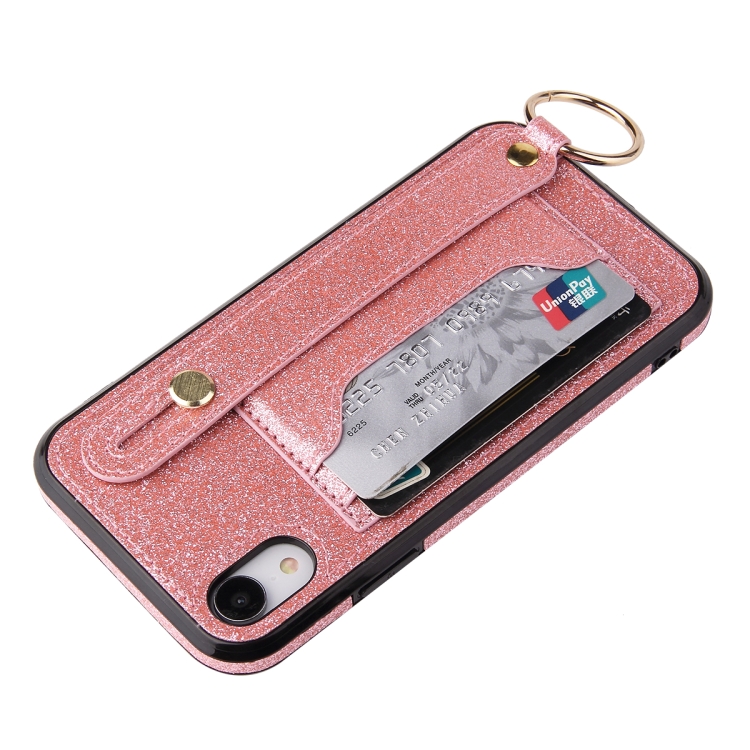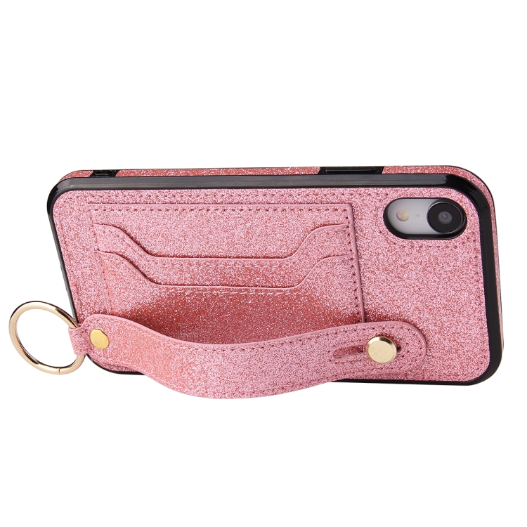 Estuche Protector para iPhone X Xs Glitter Powder PU + TPU a Prueba de Golpes con Soporte Ranuras para Tarjetas y Correa para la Muñeca (Rosa)