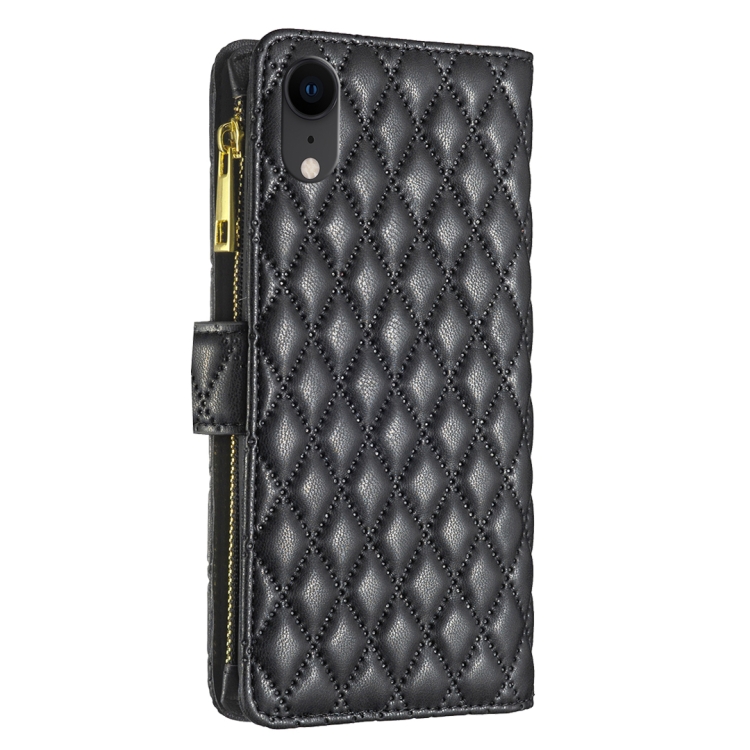 Funda para iPhone Xr Diamond Lattice Zipper Wallet de Cuero con Tapa (Negro)