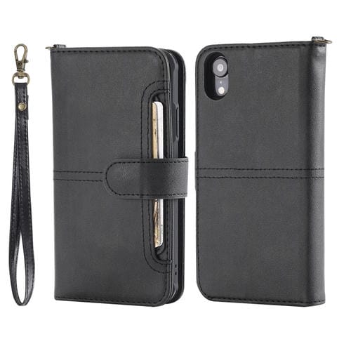 Funda de Cuero iPhone Xr con Tapa Horizontal Magnética Desmontable Multifuncional Ranuras para Tarjetas Soporte Billetera Marco de Fotos (Negro)
