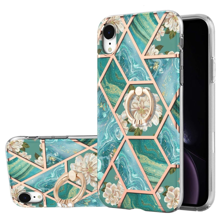 Estuche TPU para iPhone Xr Galvanoplastia Empalme Mármol Patrón de Flores Soporte Anillo Diamantes (Flor Azul)
