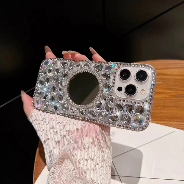 Funda para iPhone Xr Mirror PC con Diamantes de Imitación Hecha a Mano (Flor Gris Plateada)