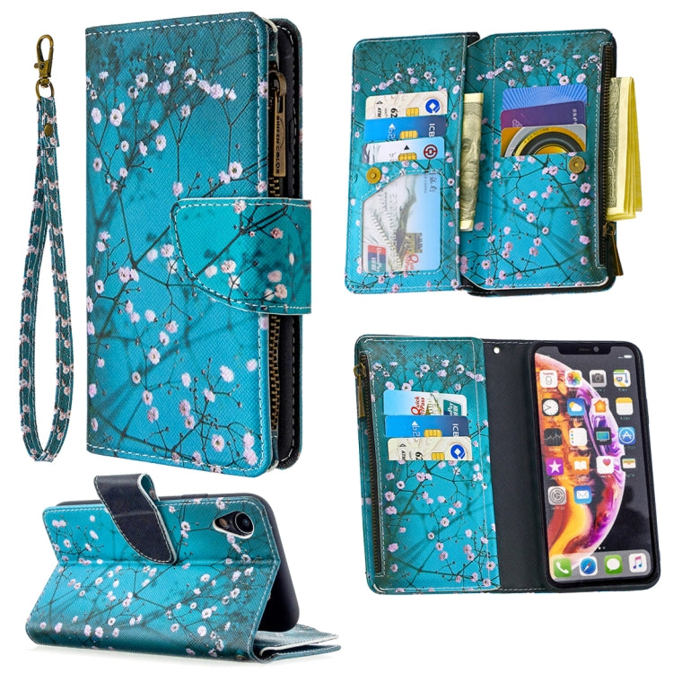 Funda de cuero para iPhone Xr patrón dibujo a color cremallera tapa horizontal soporte ranuras tarjetas billetera (Flor del Ciruelo)