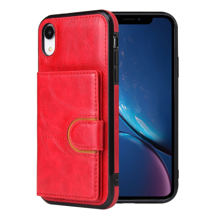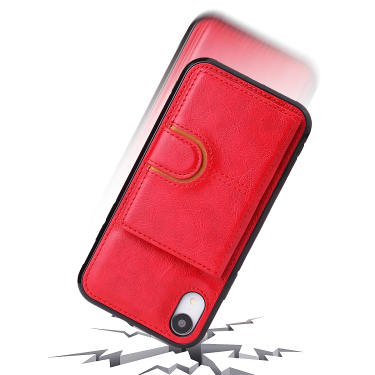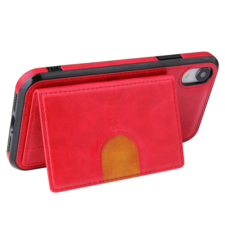 Funda Trasera para iPhone Xr Pu + TPU + PC a Prueba de Golpes con Ranura para Tarjeta y Soporte (Rojo)