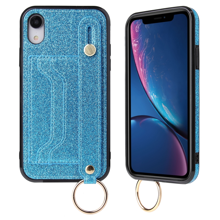 Estuche protector para iPhone Xs Max Glitter Powder PU + TPU a prueba de golpes con soporte, ranuras para tarjetas y correa para la muñeca (Azul)