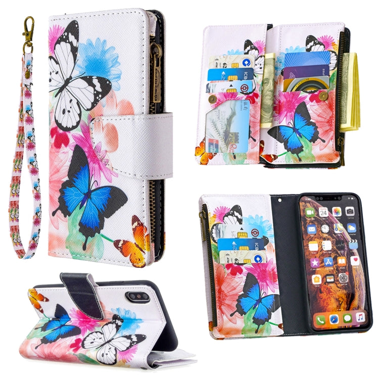 Funda de Cuero iPhone Xs Max Patrón Dibujo Cremallera Tapa Horizontal Soporte Ranuras Tarjetas Billetera (Dos Mariposas)