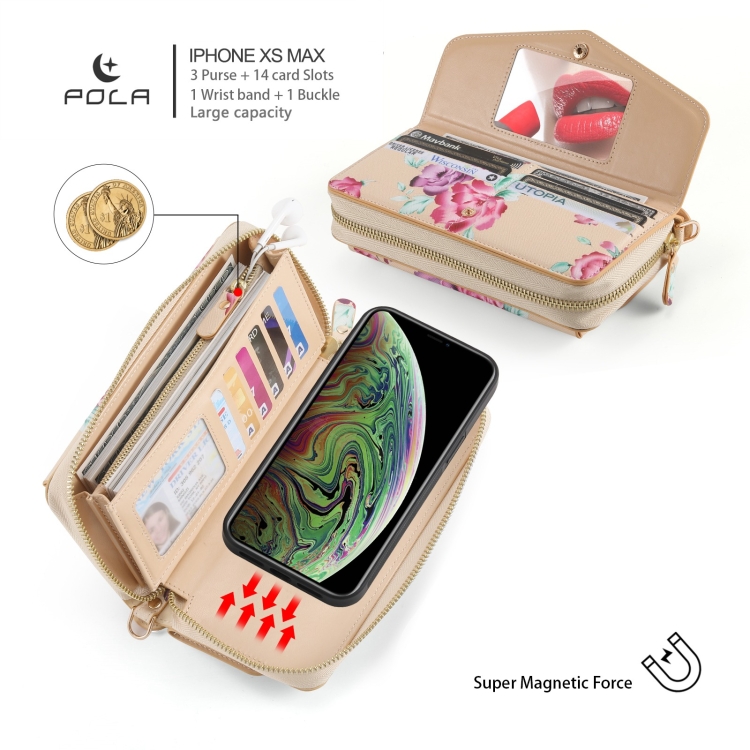 Funda de Cuero Pola Flower para iPhone Xs Max con Billetera Cruzada Multifuncional y Cremallera (Amarillo)
