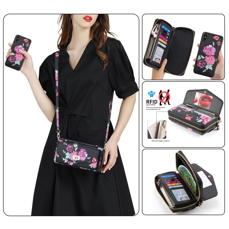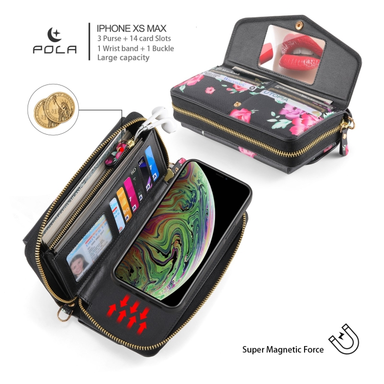 Funda de Cuero Pola Flower para iPhone Xs Max con Billetera Cruzada Multifuncional y Cremallera (Negro)