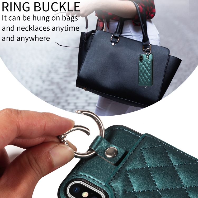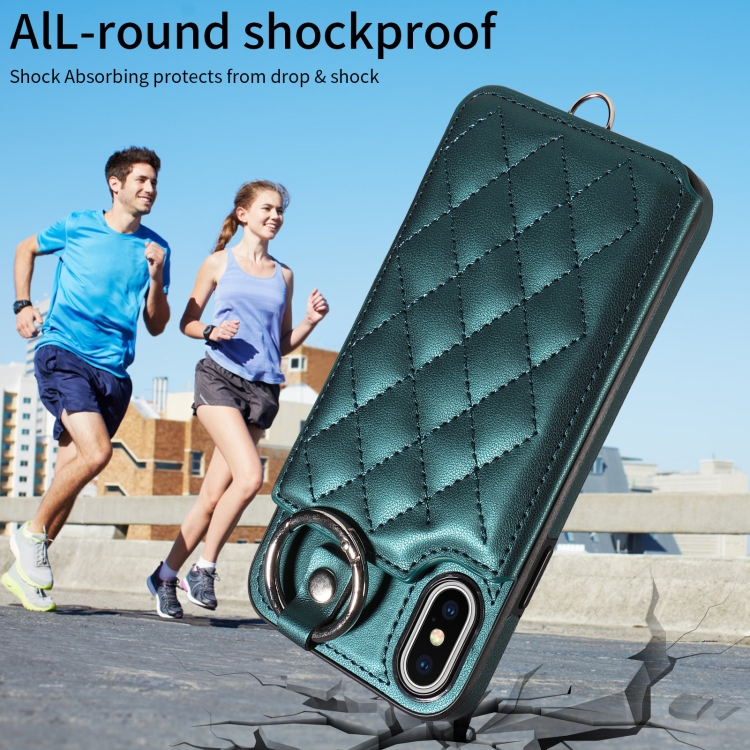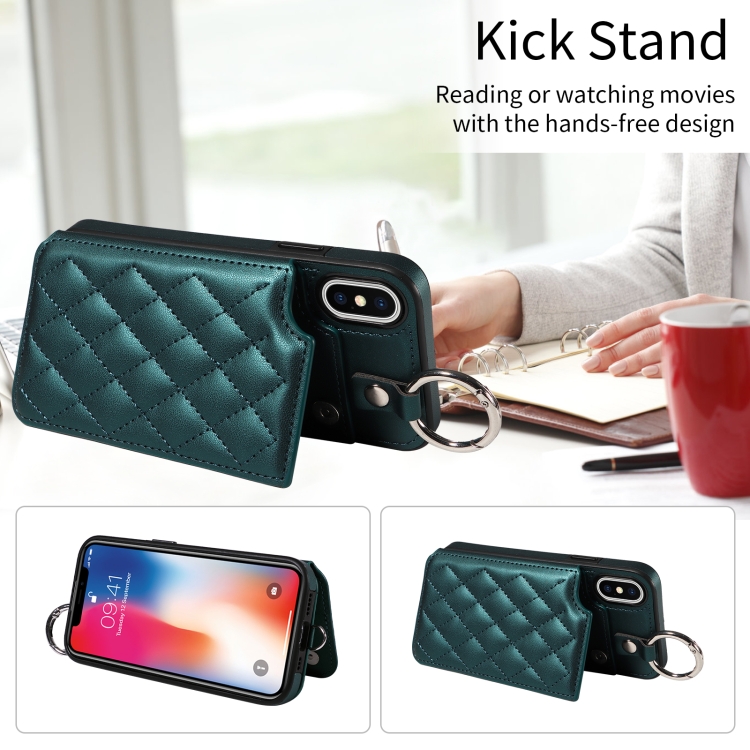 Funda para Teléfono iPhone Xs X con Bolsa para Tarjetas Textura Rómbica y Cordón Corto (Verde)