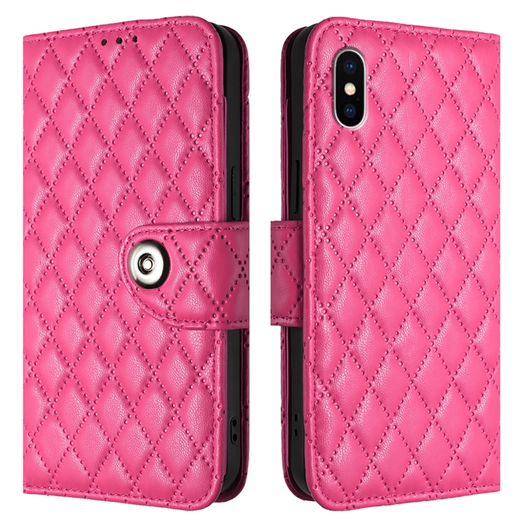 Funda para Teléfono iPhone Xs X con Tapa de Cuero Textura Rómbica y Cordón (Rojo Rosa)