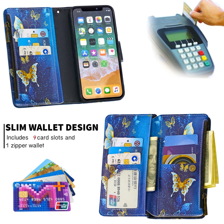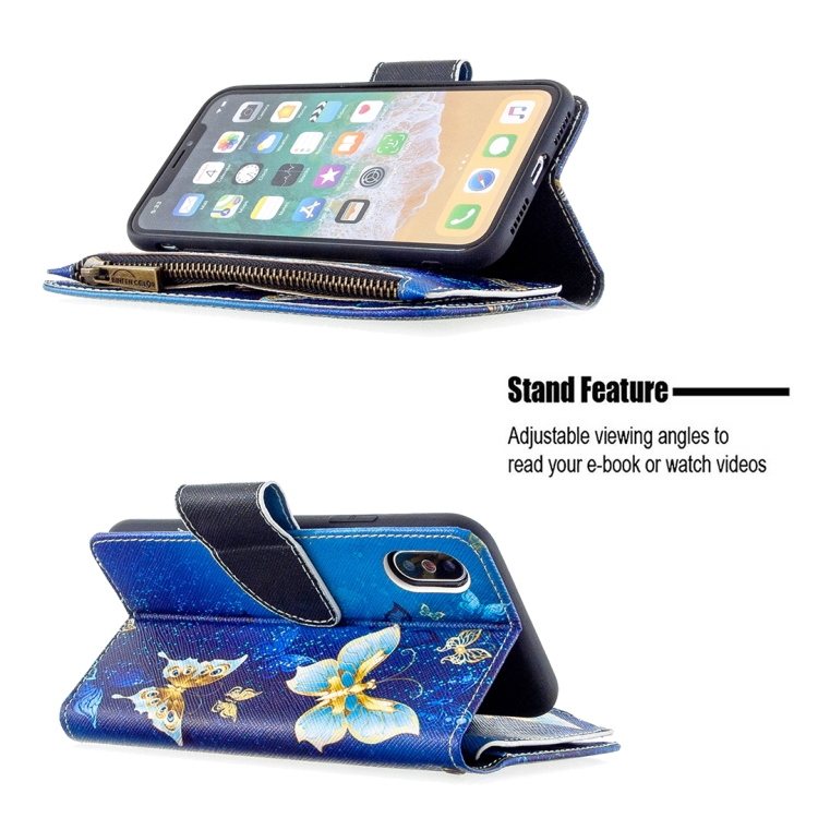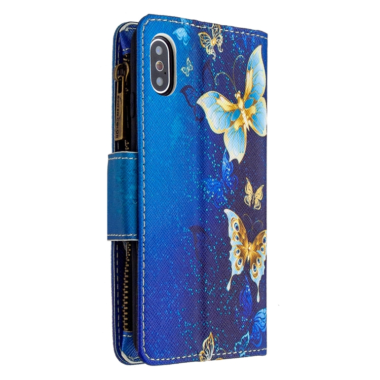 Funda de Cuero para iPhone Xs / X con Patrón Dibujo Coloreado Cremallera Tapa Horizontal Soporte Ranuras Tarjetas Billetera (Mariposa Dorada)