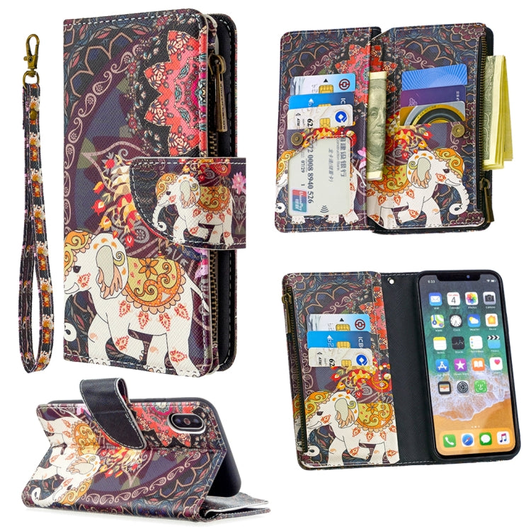 Funda de Cuero iPhone Xs X con Tapa Horizontal Soporte y Ranuras para Tarjetas (Elefantes de Flores)