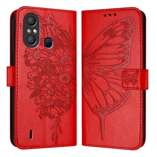 Funda de Cuero para Itel A58 / A49 con Mariposa en Relieve (Rojo)