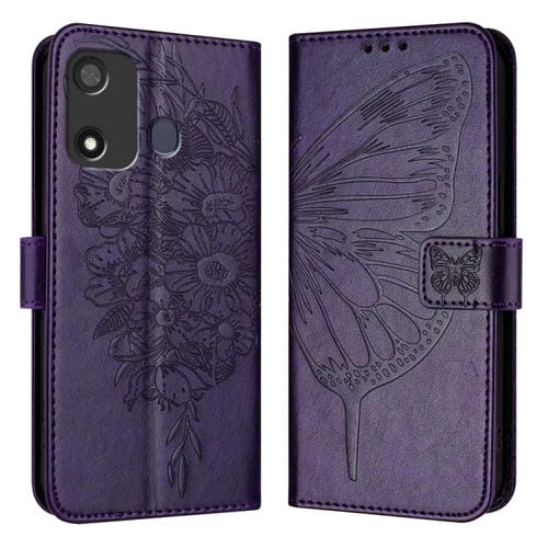 Funda para Teléfono Itel P17 / A27 de Cuero con Mariposa en Relieve (Púrpura Oscuro)