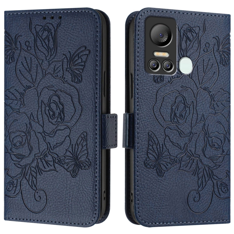 Estuche para Itel S18 de Cuero Antirrobo RFID con Rosa en Relieve (Azul Oscuro)
