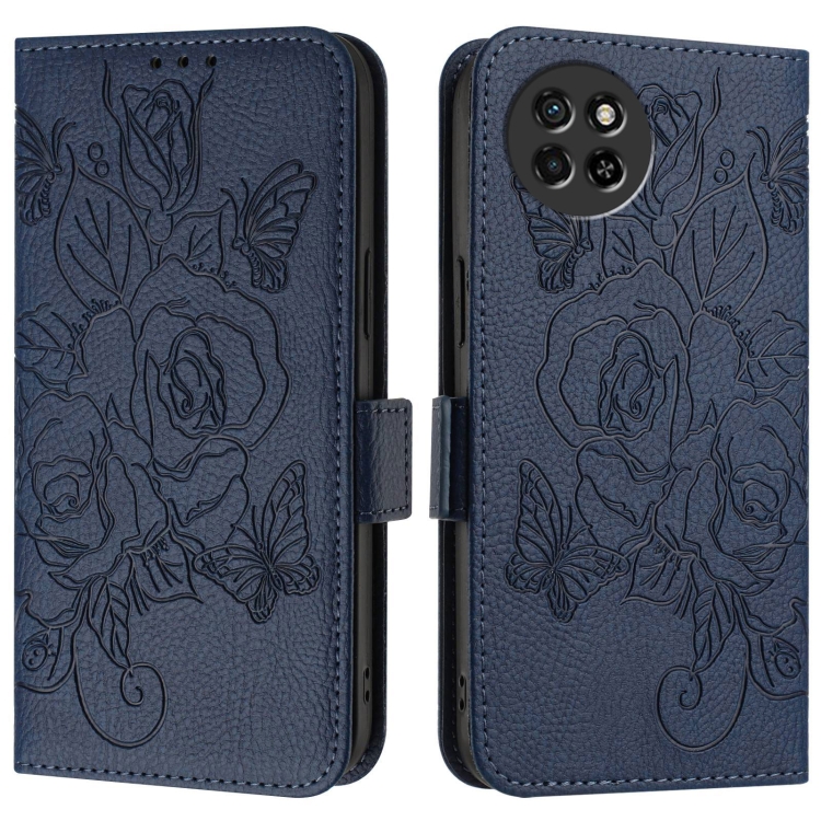 Estuche para Itel S23 de Cuero Antirrobo RFID con Rosa en Relieve (Azul Oscuro)