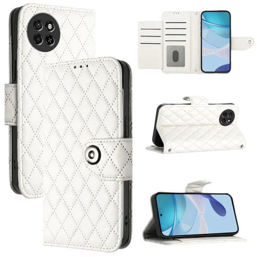 Funda para Teléfono Itel S23 S665L de Cuero con Tapa Textura Rómbica y Cordón (Blanco)