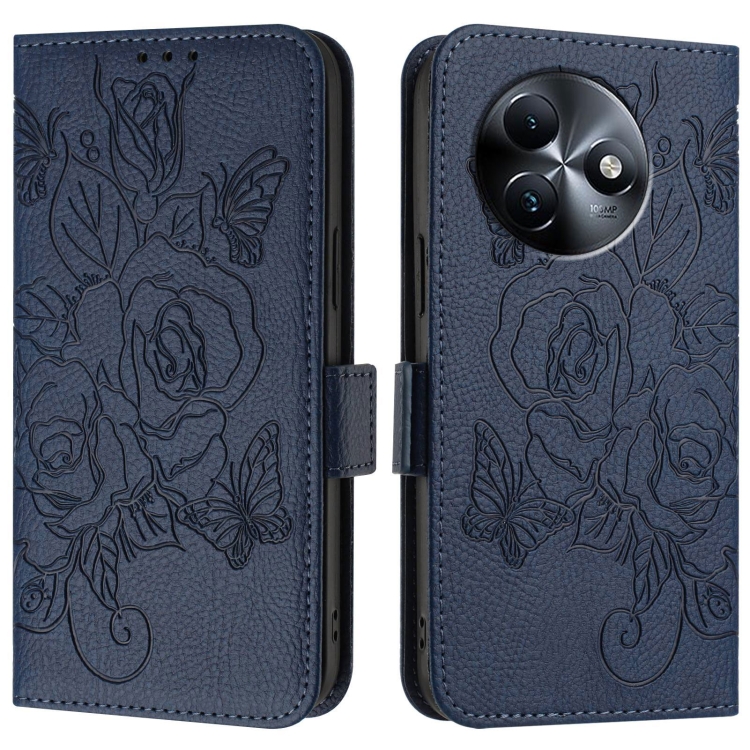 Estuche para Itel S24 de Cuero Antirrobo RFID con Rosa en Relieve (Azul Oscuro)